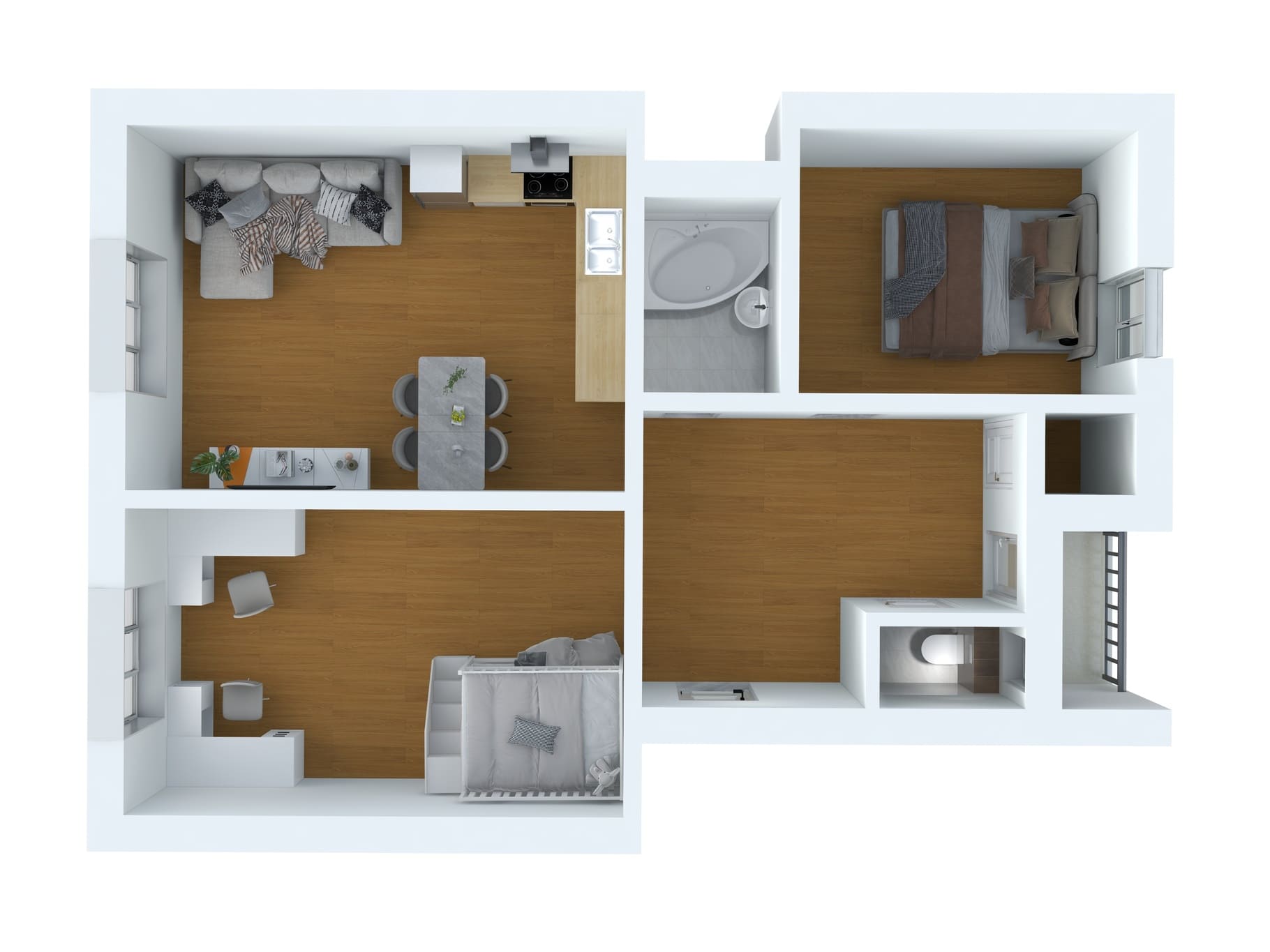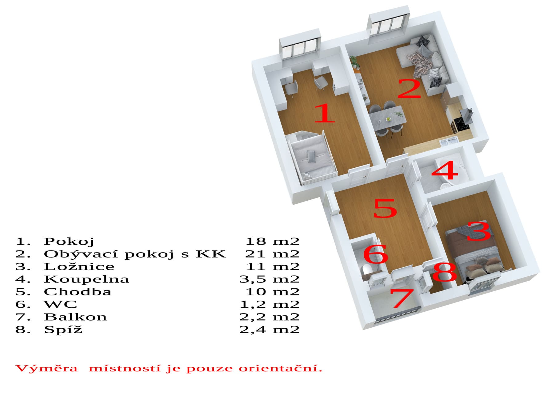 Chodba (10 m2), ze které je vstup do koupelny ( 3,5 m2 ), na WC ( 1.2 m2 ) a hlavně do obývacího pokoje s kuchyní a jídelním stolem (21 m2). Z chodby jsou samostatné vstupy do pokoje ( 18 m2 ) a do ložnice ( 11 m2 ), možnost balkonu ( 2,2 m2 ) a úložné spíže ( 2,4 m2 ) je samozřejmostí.